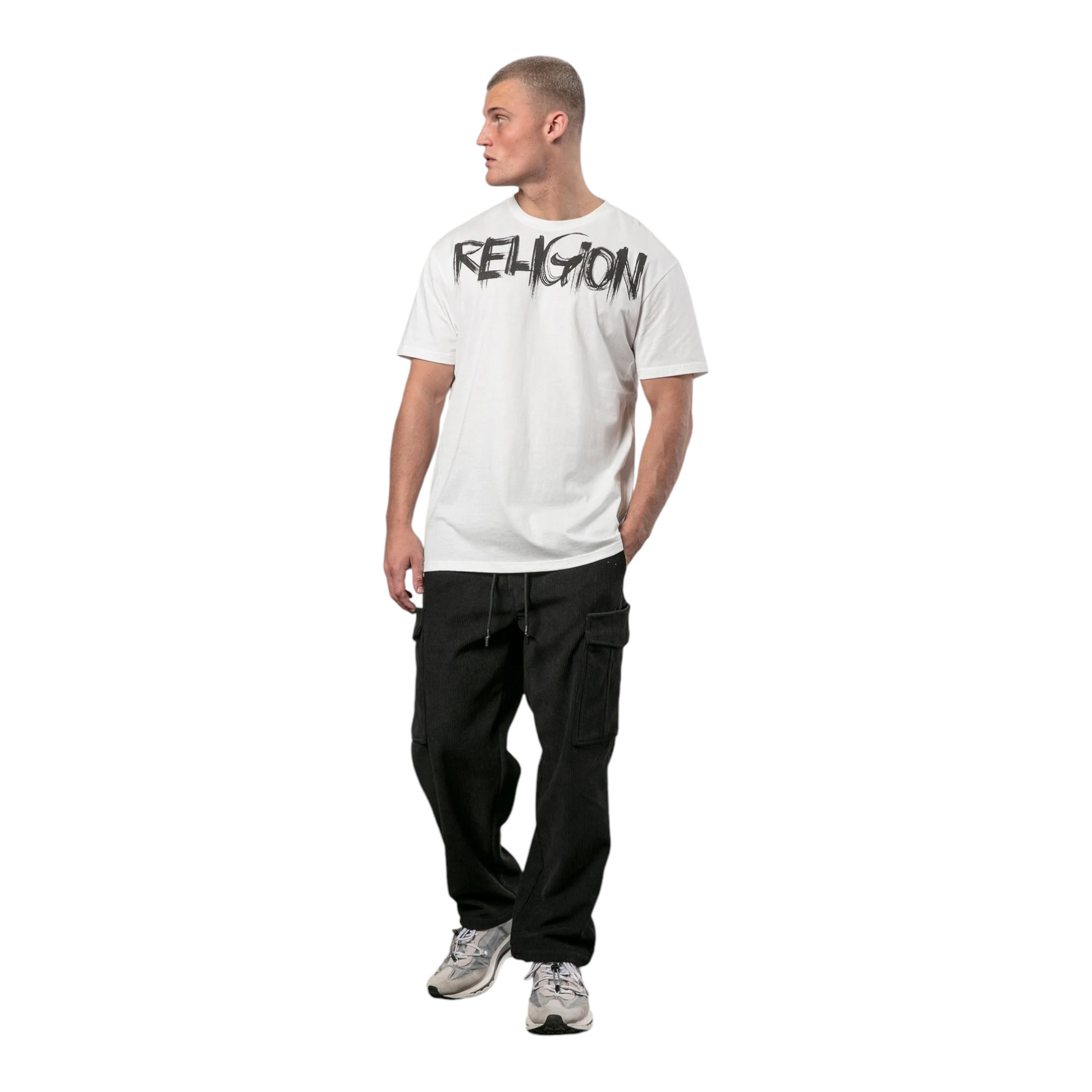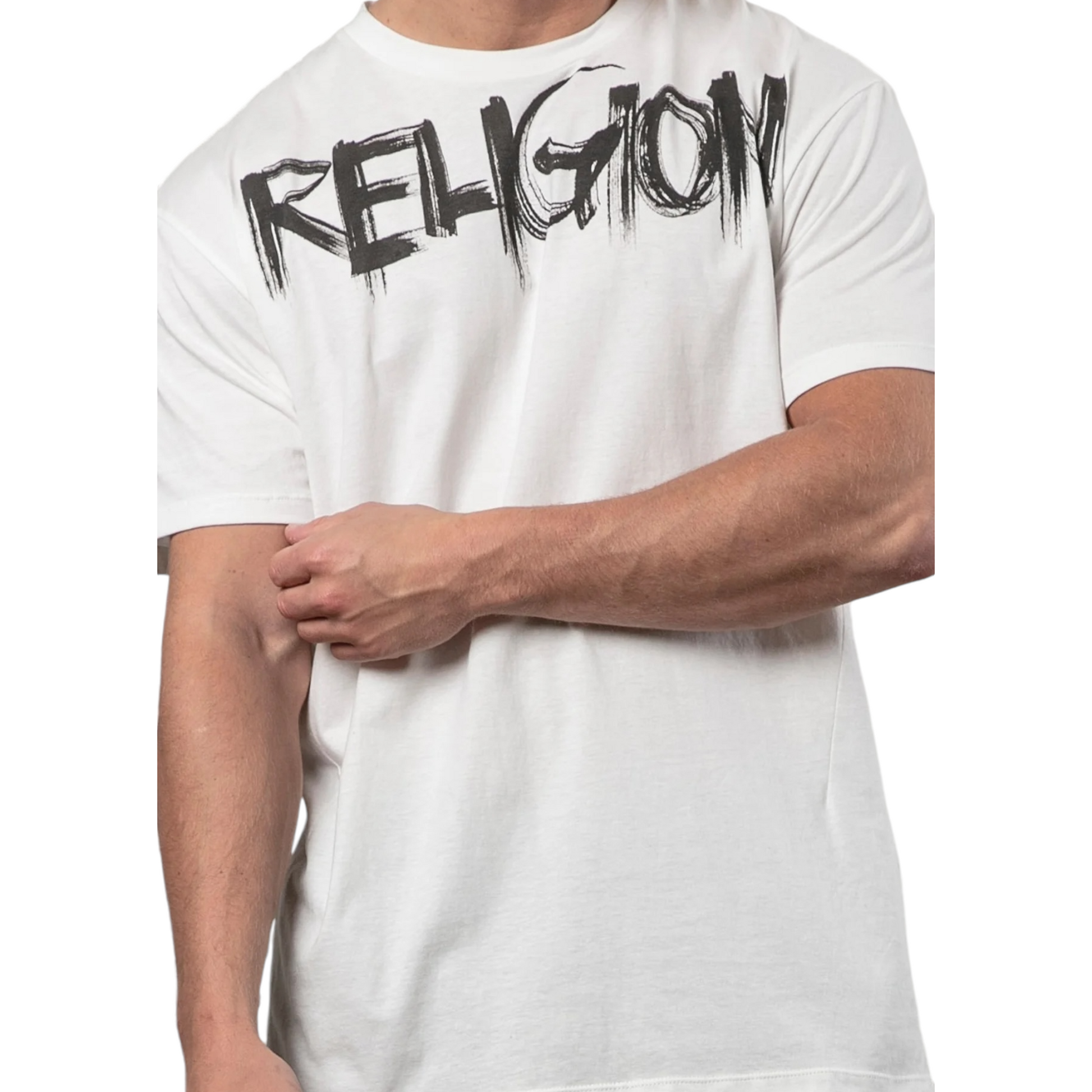 La T-shirt Religion in cotone, ha una vestibilità comoda e rilassata. Presenta la stampa Religion con effetto spennellata sul petto. Completa il tutto il dettaglio della croce a punto catenella sul retro. Perfetta per l'uso quotidiano.
