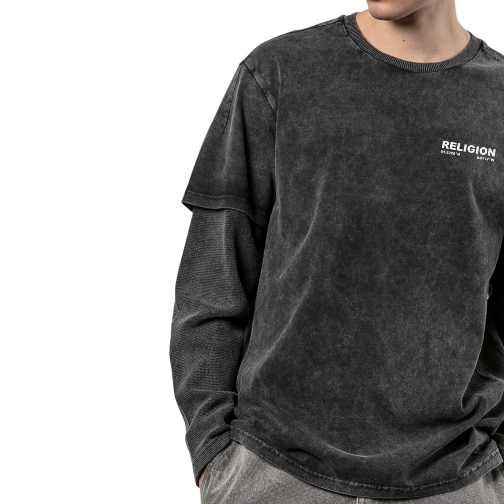 La T-shirt manica lunga Wash in lavaggio acido nero ha una vestibilità comoda e rilassata. Presenta il logo Religion in gomma sul petto. Con pinces anteriori e posteriori, offre un look sartoriale ma rilassato, che la rende perfetta per l'uso quotidiano. La manica presenta un doppio tessuto che esalta la particolarità del modello.