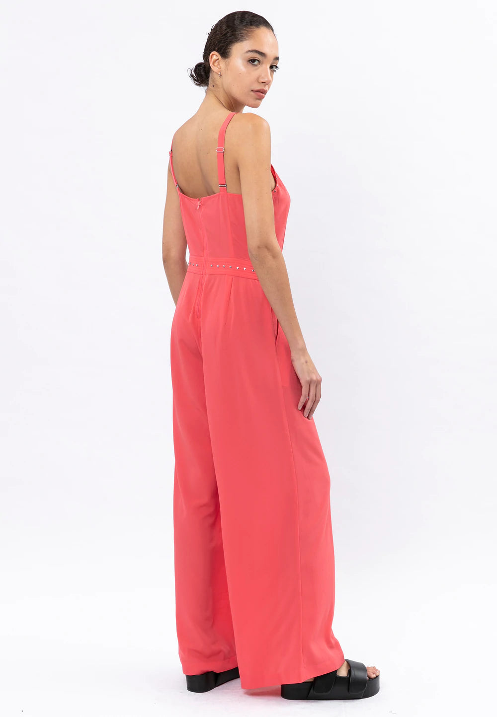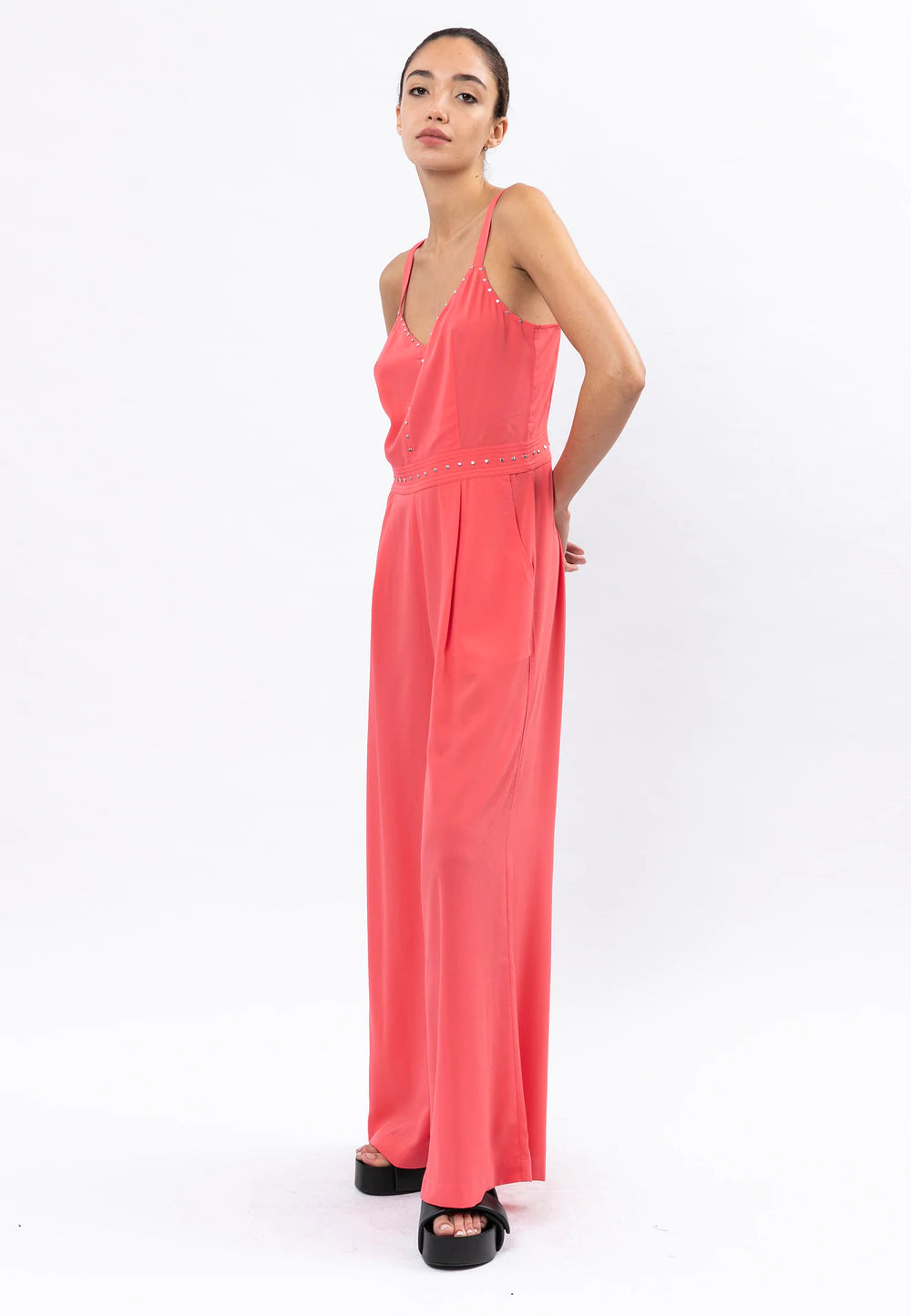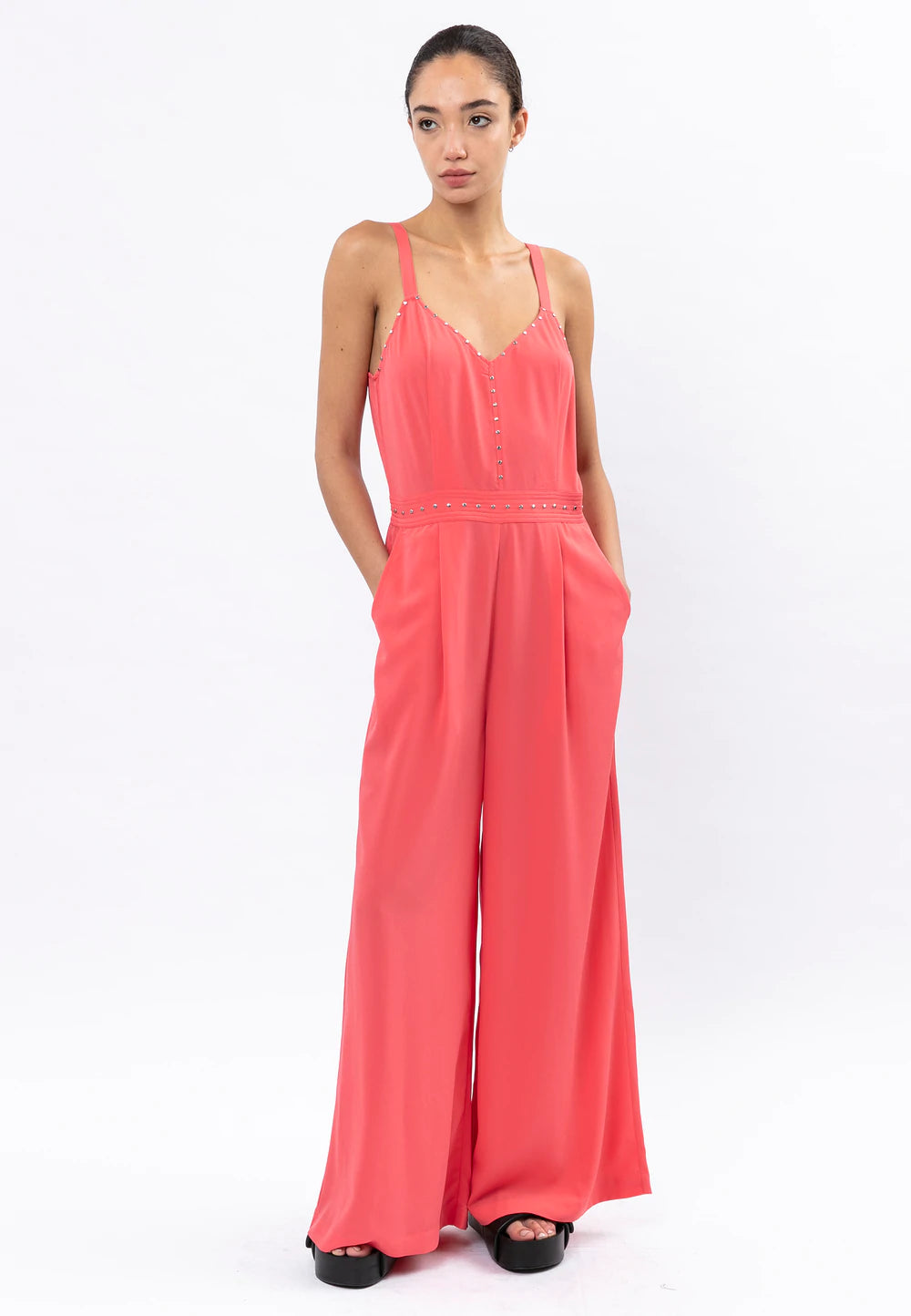 Scambia il tuo vestito con la tuta Moissanite in crêpe testurizzato corallo. Questo modello ha un corpetto aderente, gambe larghe, spalline regolabili e dettagli con borchie per dargli quel tocco rock 'n roll. Perfetto per il giorno e la sera e ottimo da solo o indossato con un blazer. Regola le cinghie prima di provarlo.