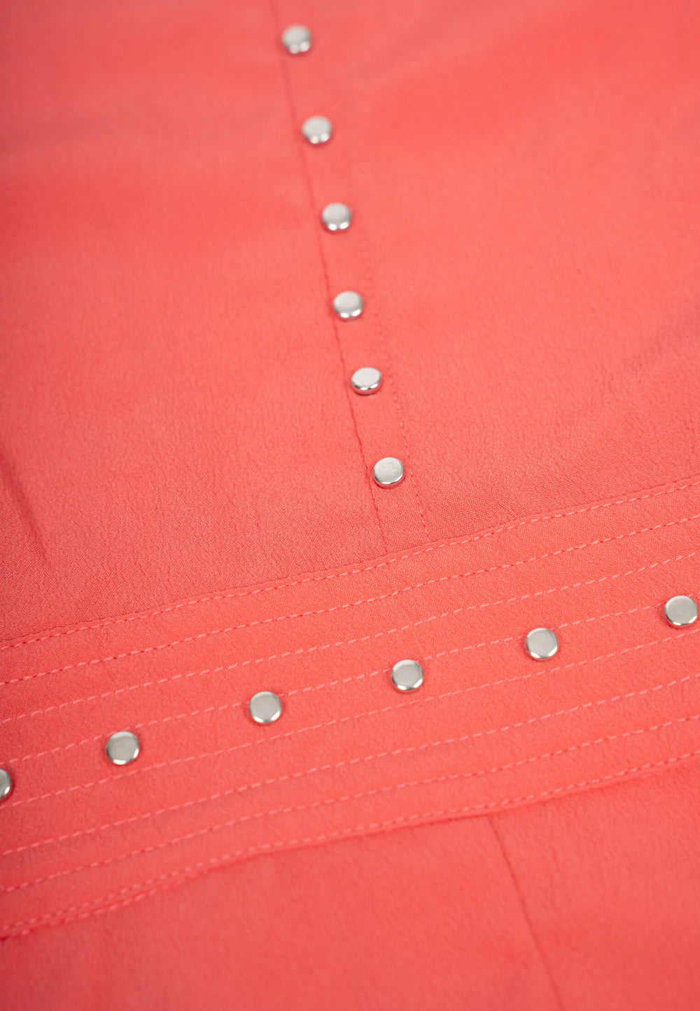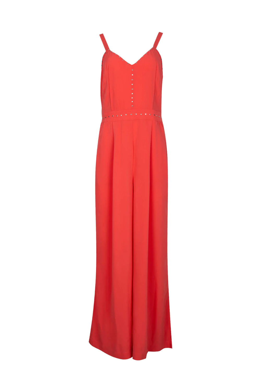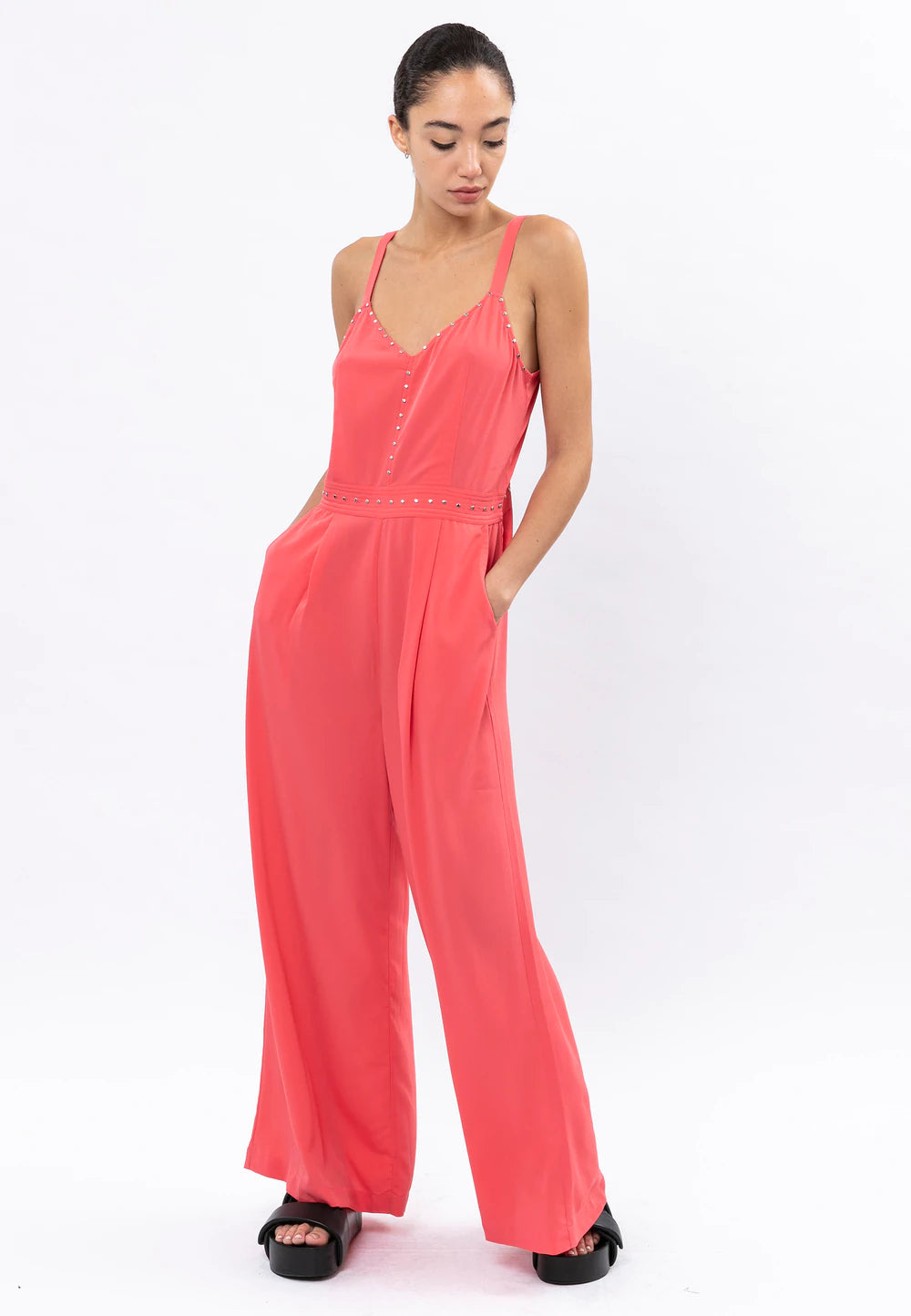 Scambia il tuo vestito con la tuta Moissanite in crêpe testurizzato corallo. Questo modello ha un corpetto aderente, gambe larghe, spalline regolabili e dettagli con borchie per dargli quel tocco rock 'n roll. Perfetto per il giorno e la sera e ottimo da solo o indossato con un blazer. Regola le cinghie prima di provarlo.