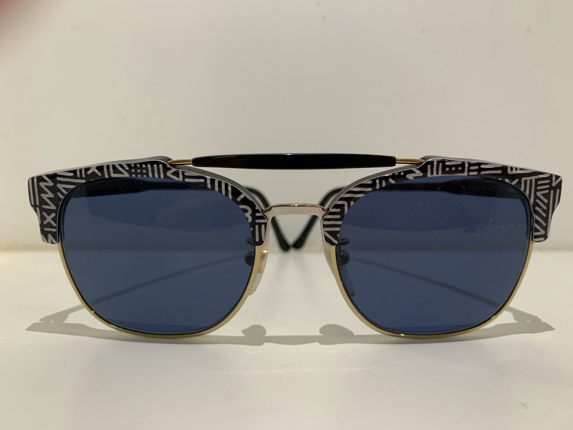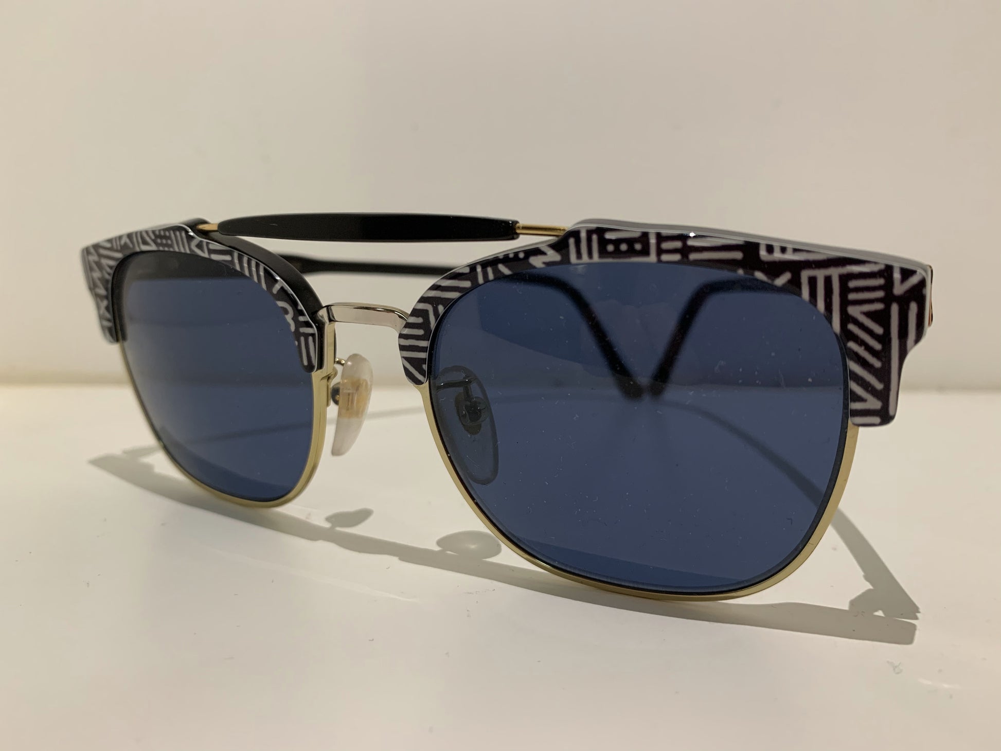 Occhiali da sole in acetato con disegni geometrici. Ponte e nasello in metallo, lente blu .