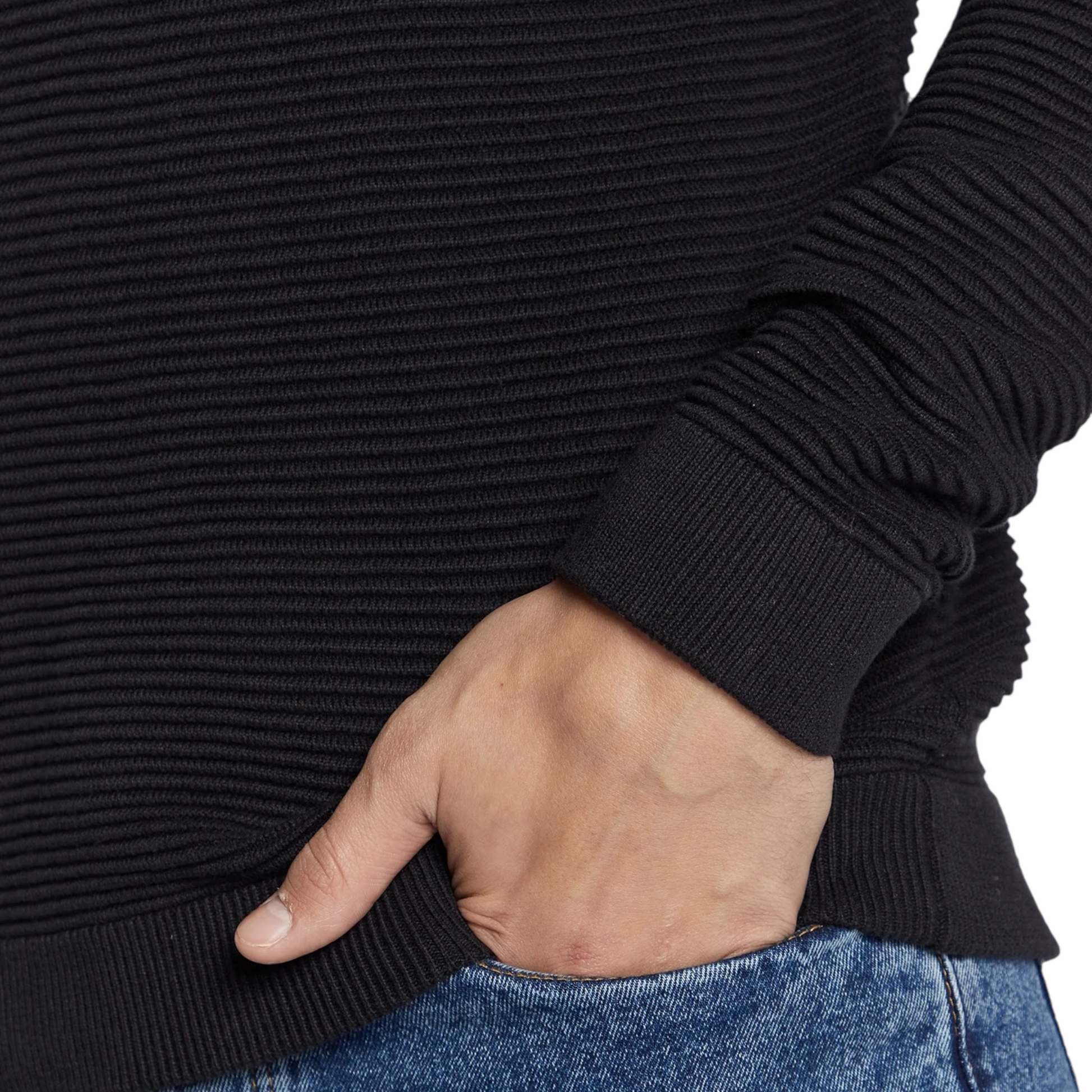 Questa maglia girocollo a manica lunga presenta una raffinata finitura a righe orizzontali che aggiunge carattere al capo. Il collo, il fondo e i polsini a costine assicurano una vestibilità aderente e definita, garantendo comfort e stile. Ideale per chi cerca un design minimalista con dettagli curati. Il patch con il logo non è presente sulla maglia.