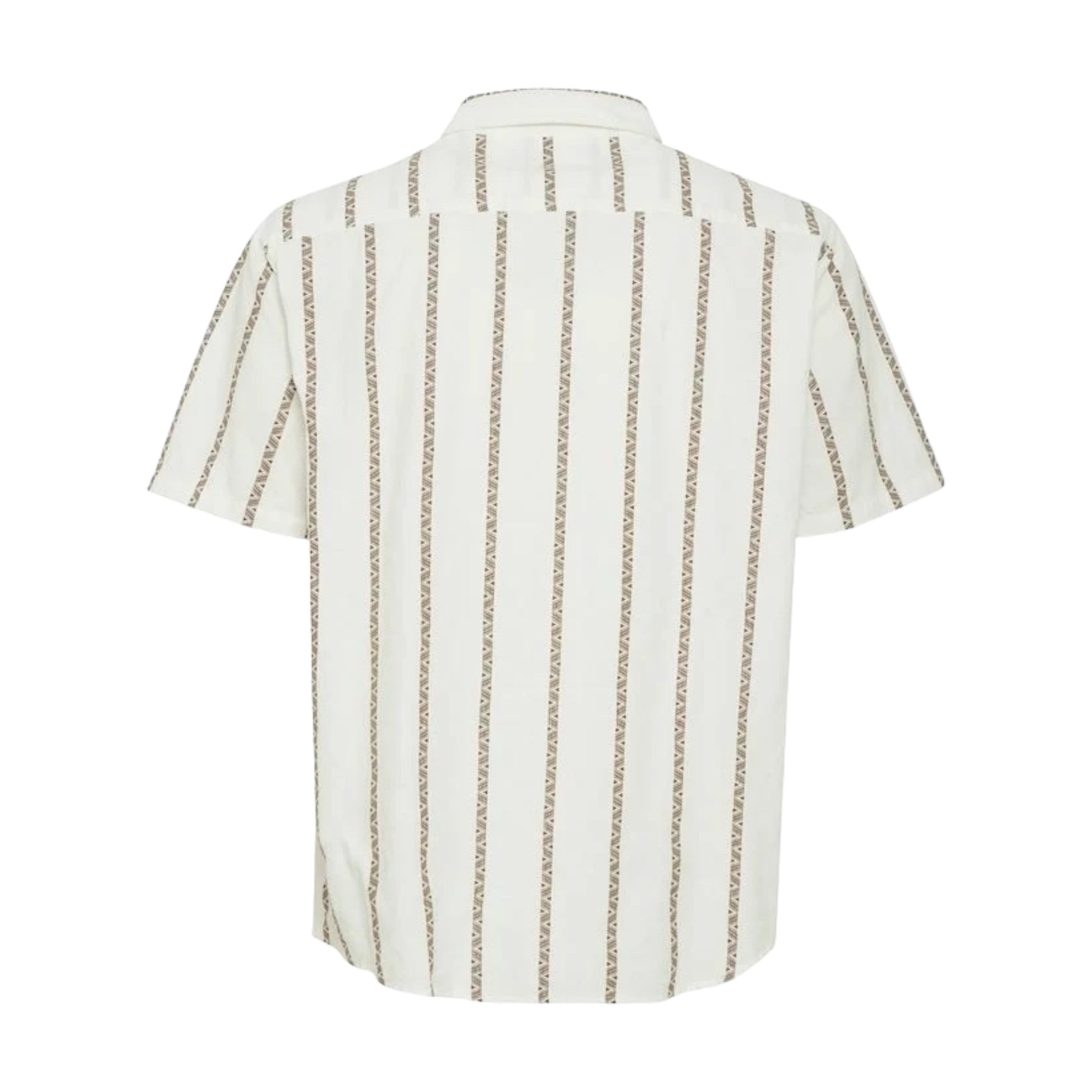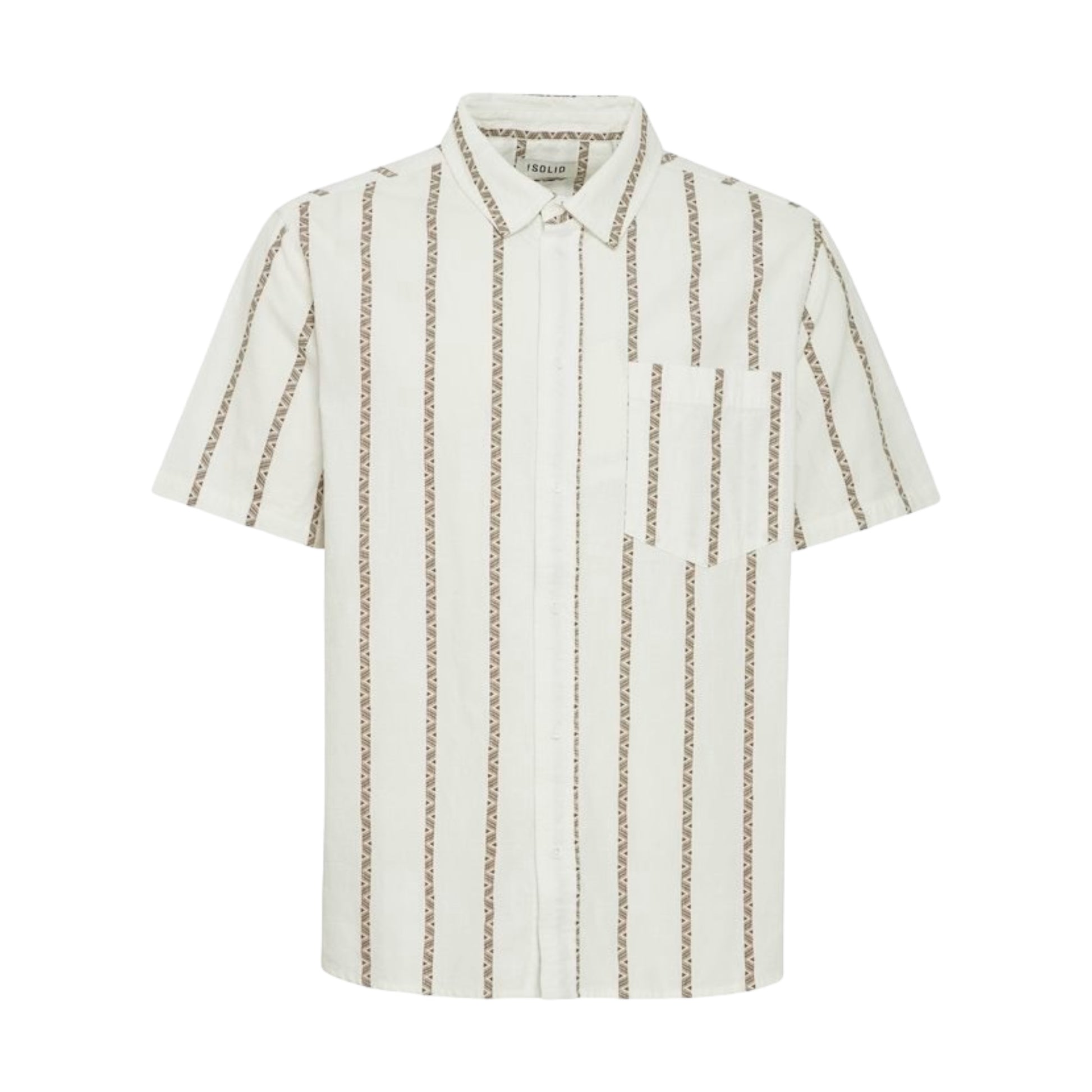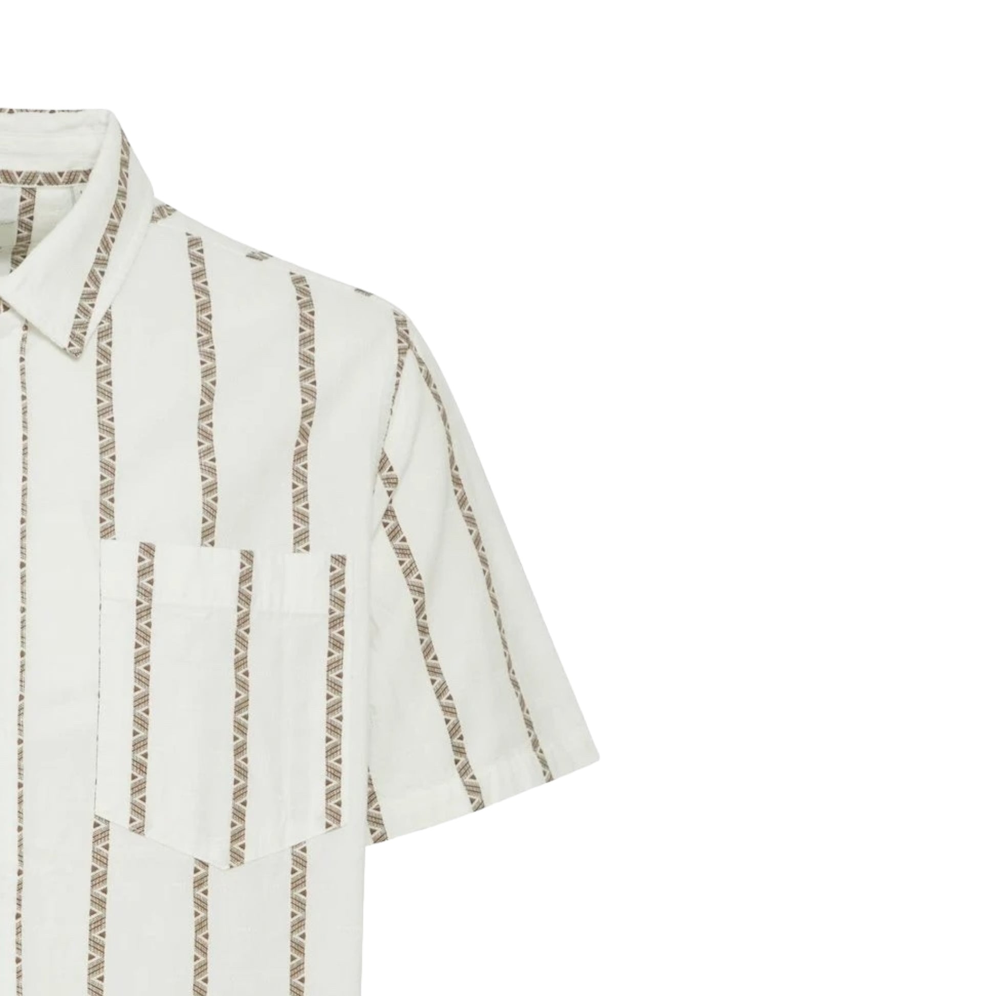 Camicia mezza manica realizzata in cotone con motivo etnico. Collo italiano, chiusura frontale con bottoni e taschino frontale a toppa. Vestibilità regular.