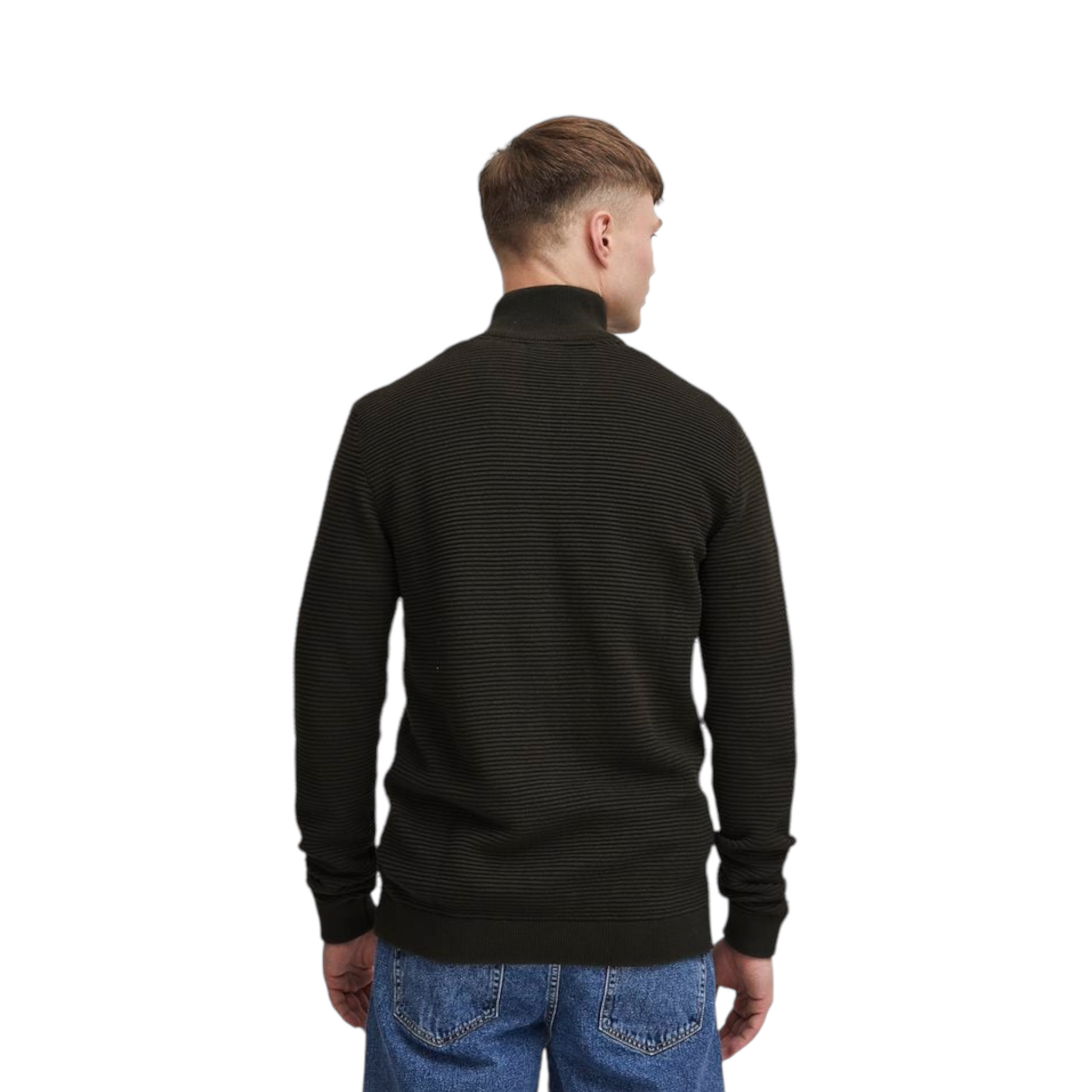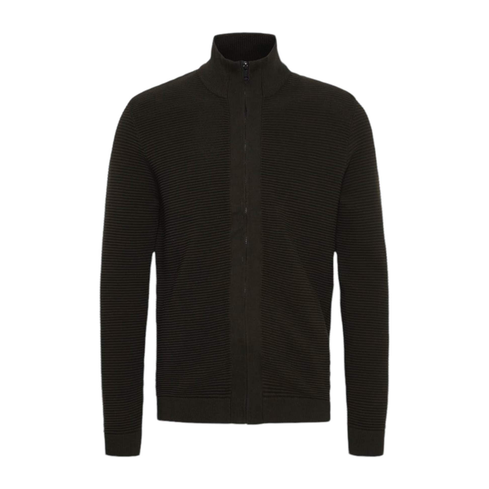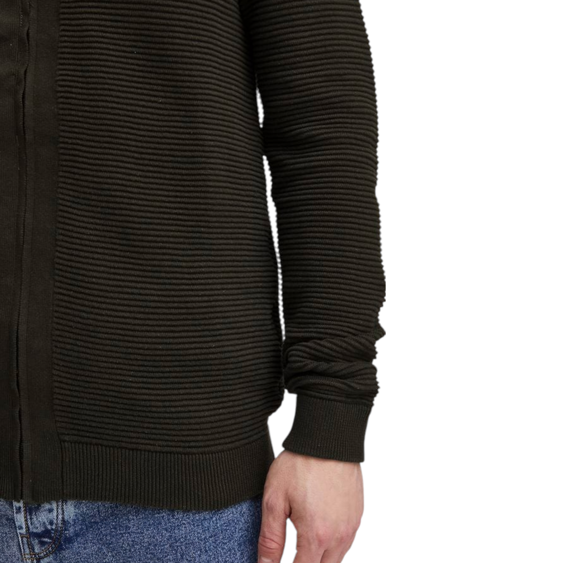 Cardigan manica lunga realizzato in cotone con chiusura frontale con zip a scomparsa. Collo, fondo e polsini a costine. Lavorazione a righe strette orizzontali.