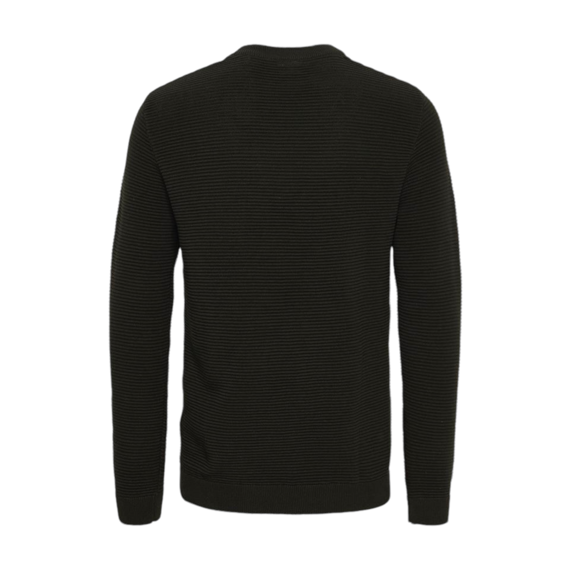 Maglia girocollo manica lunga. Collo, fondo e polsini a costine. Lavorazione a righe strette orizzontali.