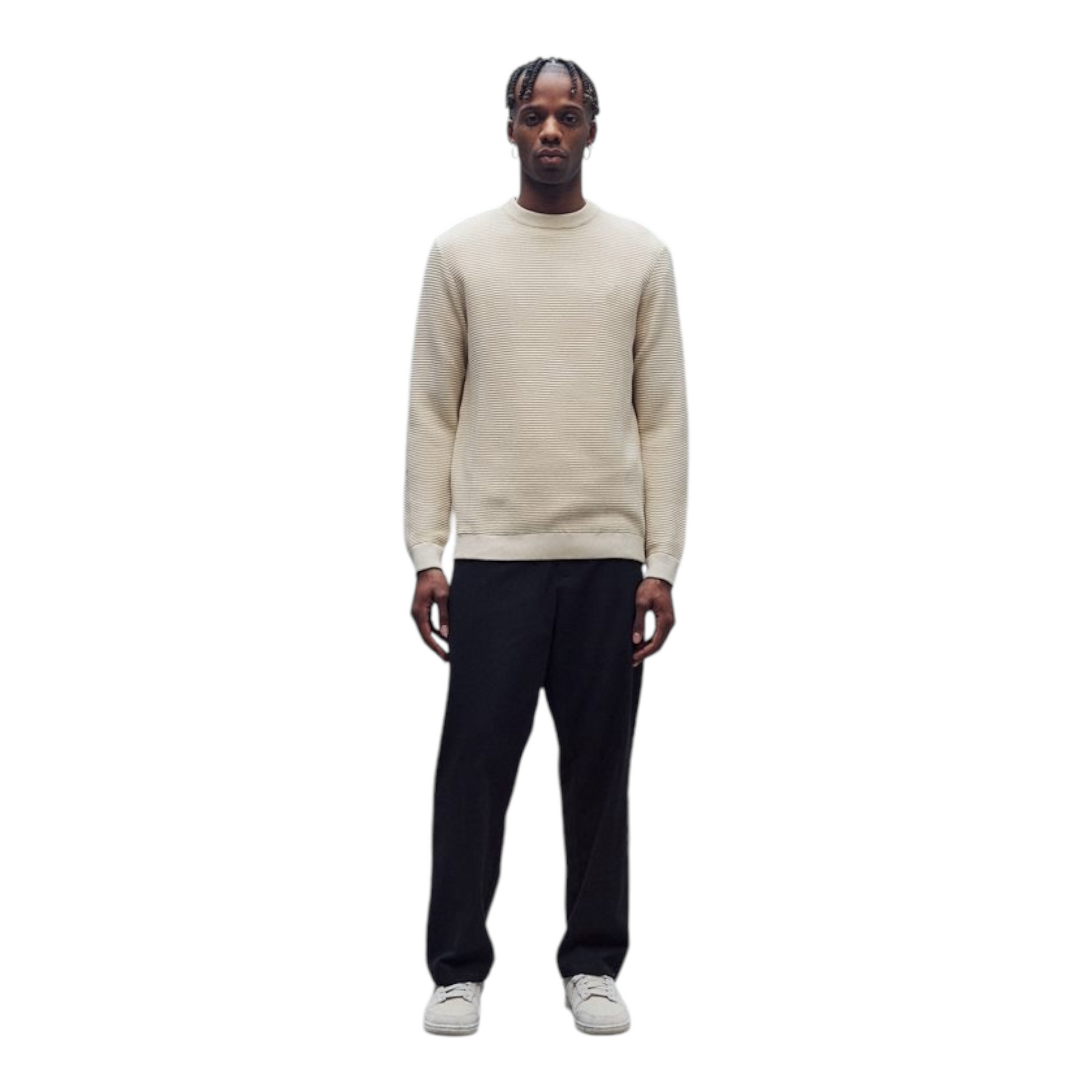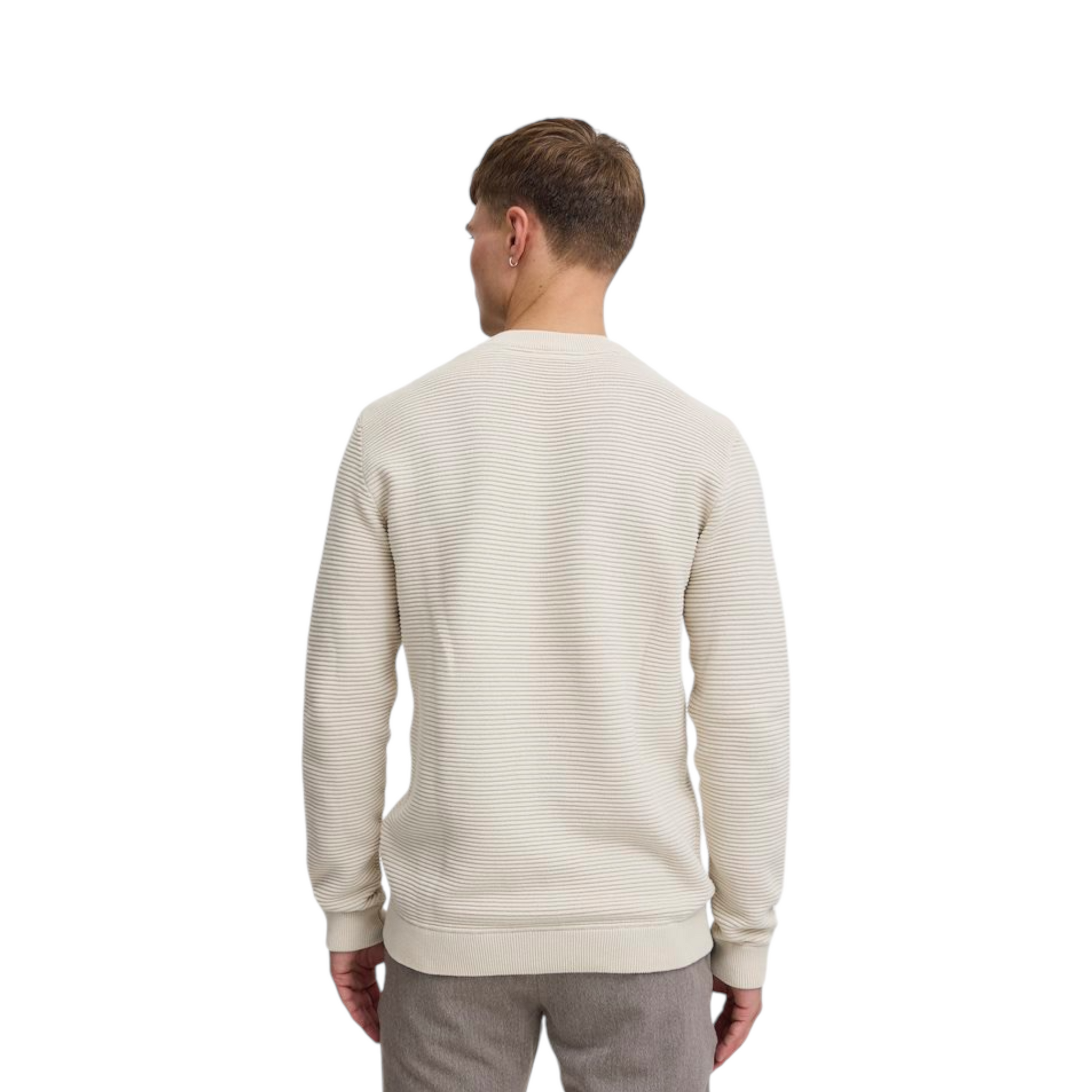 Maglia girocollo manica lunga. Collo, fondo e polsini a costine. Lavorazione a righe strette orizzontali.