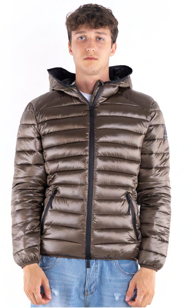 Piumino con cappuccio, tasche anteriori e chiusura zip.