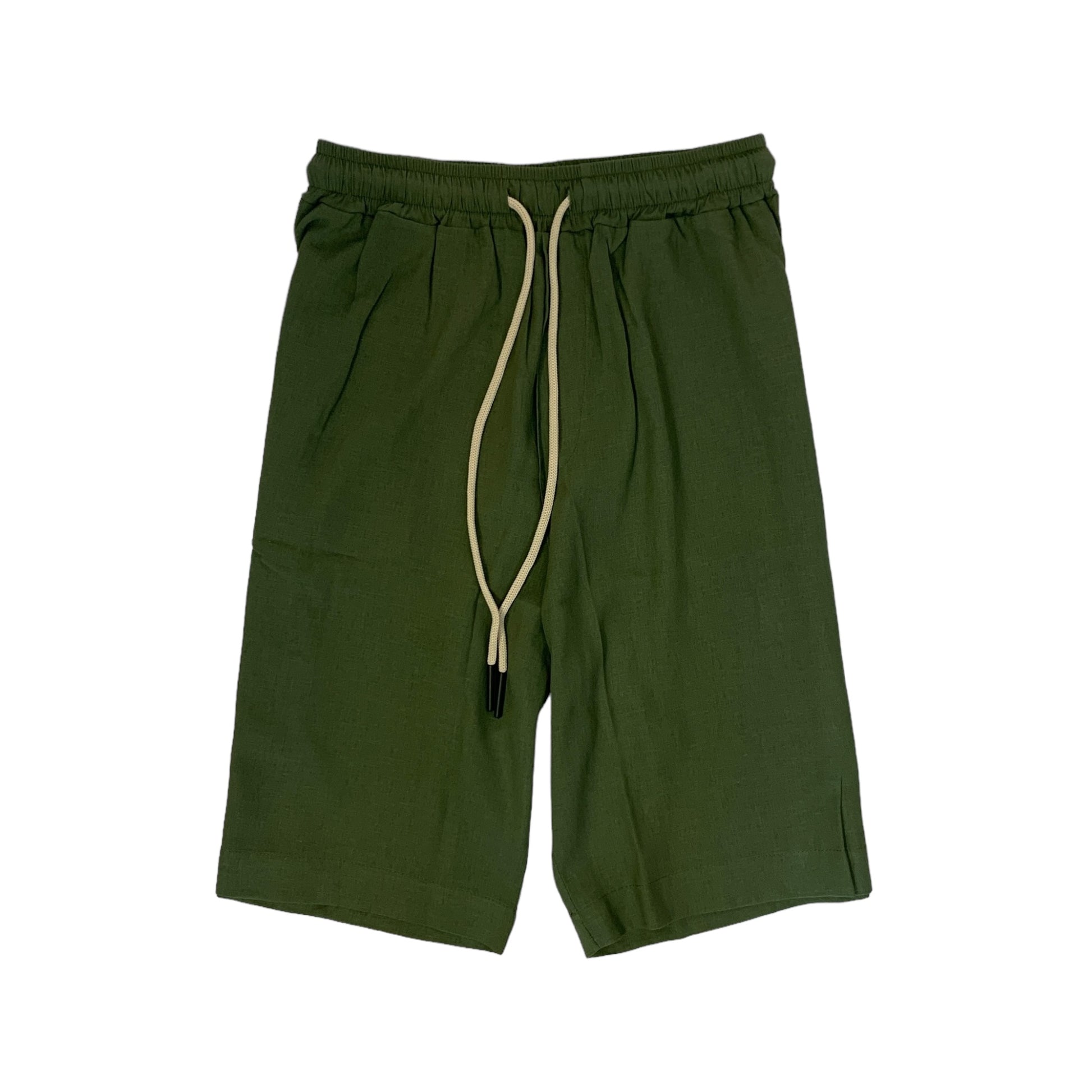 Shorts realizzato in lino e viscosa. Vita elasticizzata con laccio regolabile. Tasche a filo. Long fit.